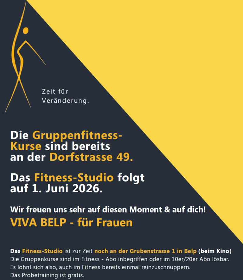 - Das Fitnessstudio ist zur Zeit noch an der Grubenstrasse 1 (beim Kino). Per 1. Juni 2026 folgt auch dieses an die Dorfstrasse 49.